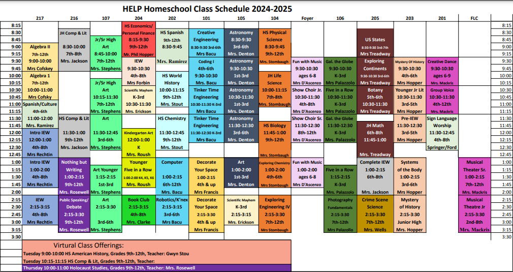**HELP will be offering 3 virtual classes on Tuesday mornings next year. We recognize that with families wanting or needing to travel more that this might be an option that they want to help meet their homeschooling need for the subjects we are offering virtual. We are also aware of the rising gas prices and the need for families to get all the academic needs of their student met. With so many options available at a one day a week program, sometimes it is quite difficult to get all the classes that they want in one day, but don’t necessarily want to have to drive a second day to attend classes to meet their academic needs. By offering these virtual classes, parents and families may be able to access all the classes that they need through 1 program.